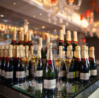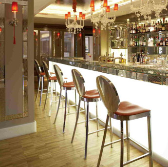 Bespoke engraved mirror tiles on the walls, columns and bar reflect lights from the crystal chandeliers above, giving glitter and sparkle to this contemporary bar. White onyx, and a palette of greys and vivid orange evokes a fun and lively atmosphere, the perfect place for an aperitif before or after a relaxed dinner in The Brasserie. Open from 11am - 11pm daily.
