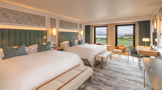 Situated on the ground floor, the Classic Twin Rooms at The Europe Hotel & Resort offer two sumptuous queen-size beds and two expansive floor-to-ceiling windows, framing tranquil views of the hotel’s lush gardens, Lough Léin and the majestic MacGillycuddy Reeks. While these rooms do not feature a balcony, the generous windows create the perfect vantage point to soak in the breathtaking scenery from the comfort of your room.