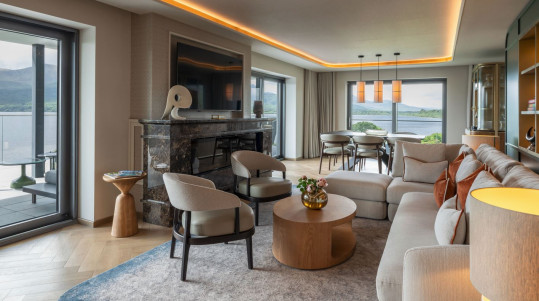 The One Bedroom Penthouse Suite offers luxury and elegance in a contemporary style. Framed by a backdrop of the Lake, Mountains and the adjacent O'Mahony's Point golf course, this large suite includes 1 double bedroom with super king size bed, en-suite bathroom with separate bath & shower, a guest cloakroom, a spacious and bright separate living room plus a large balcony, taking in some of Kerry’s finest views.
